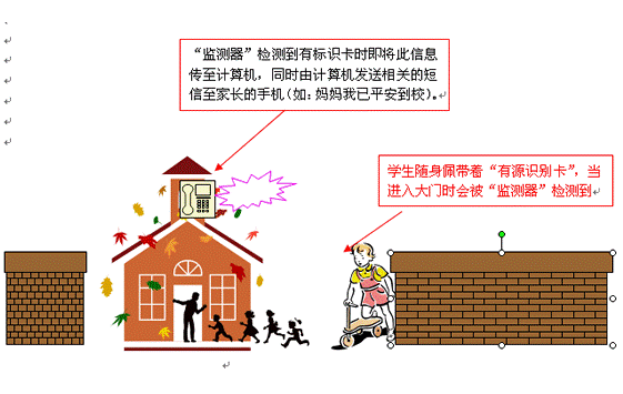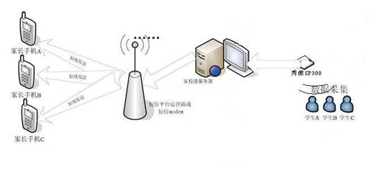 1. 系統(tǒng)原理:本系統(tǒng)的基本運用原理大致為每個學生只要帶有一枚RFID即無線感應標識卡,在到達學校大門后,校門附近的感應器就會讀到標識并將信息傳給計算機,由計算機分別向相關的學生父母手機發(fā)送一條短信,如“爸爸,我已平安到校了”“爸爸,我放學了,一會就回家”,同時在計算機中也會保存所有學生的進出信息,并將它整理成報表供學校、家長查詢。利用該短信平臺班主任可將每個學生的在校學習和生活情況等定時或不定時的集中或單獨發(fā)送至家長的手機,免去老師逐一通知或家長缺席家長會等情況而產(chǎn)生的各種交流屏障,方便快捷。該類似系統(tǒng)在美國、歐洲等發(fā)達國家已得到廣泛應用,已成為老師和家長溝通的橋梁, 廣受歡迎。