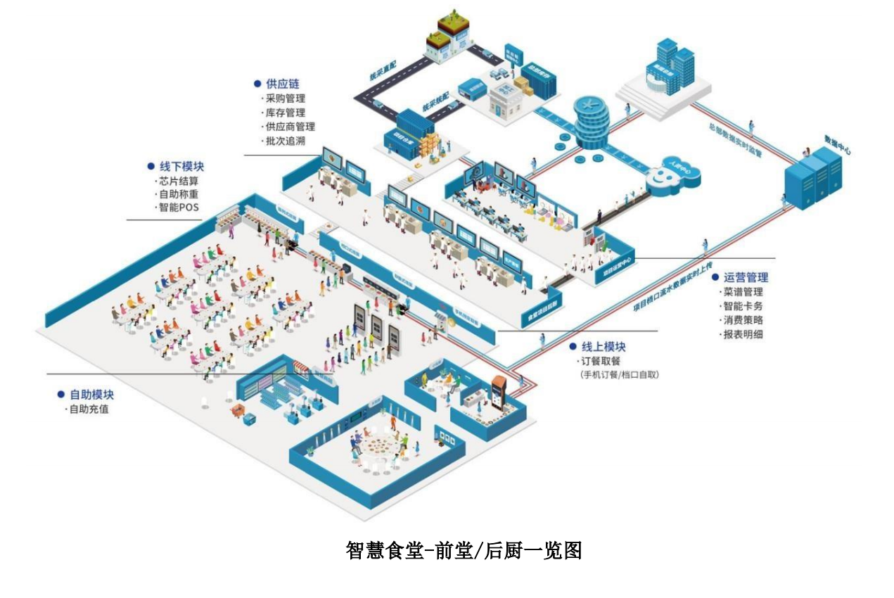 智慧食堂周邊建設,作為數字化健康食堂的整體建設,從食堂消毒、廚余處理、自動售貨機、炒菜機器人等各類周邊設備進行一體化集成,打造數智化健康食堂。