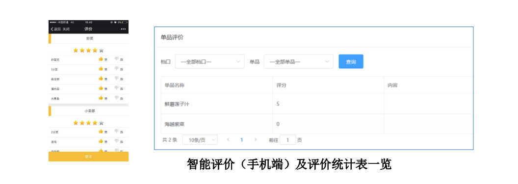 智能評價,使員工就餐后可在網上直接評價菜品質量,通過統計分析,助力于食堂隨時聆聽員工建議、不斷優化菜譜結構與服務模式,合理備餐、精準運營。